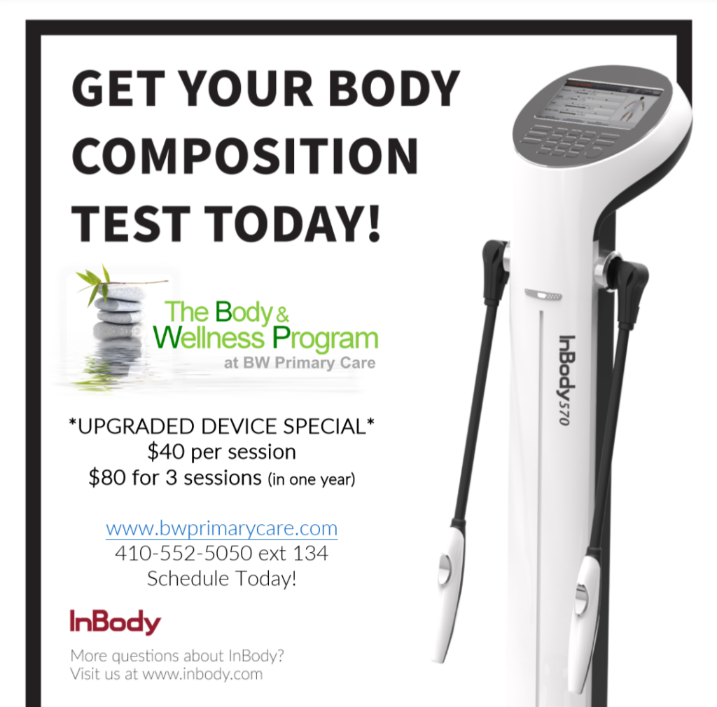 The InBody 570 is an advanced technology scale/sensor machine that does bioimpedence analysis of all components of the body to include fat mass, muscle mass, water/edema and visceral fat. It gives the most accurate information about your body composition, more accurate than the number on your scale. Use it during your weight loss and fitness journey to target improving muscle density while shaving the fatty tissue. This is essential to overall longevity and health. It is recommended that it is done in intervals of 4-8 weeks to monitor progress during weight loss or when on an exercise program. The readings can also be very useful for monitoring those with LOW muscle mass, known as sarcopenia, which is associated with poor health and physical strength. Ask your clinician about using this highly beneficial test!
